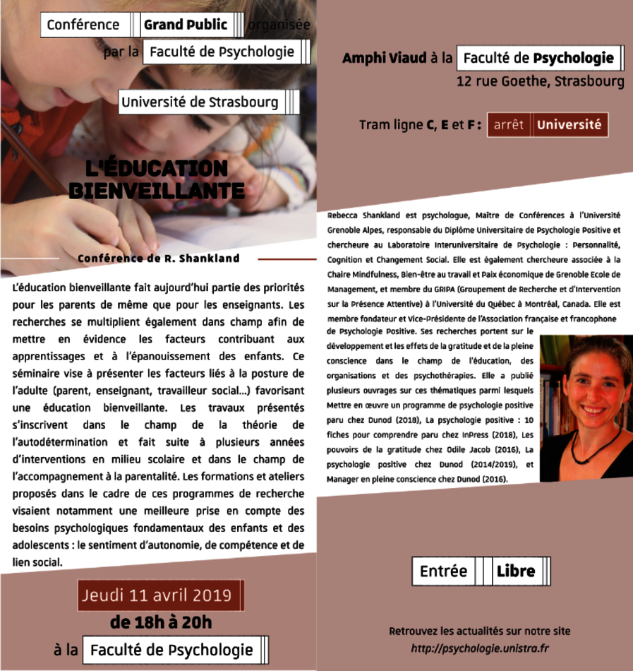 L'éducation bienveillante Conférence Conférence grand public de Rebecca Shankland, organisée par la Faculté de psychologie de Strasbourg. 11 avril 2019 20h 18h Faculté de psychologie (amphi Viaud) - Strasbourg Entrée libre. Consulter l'agenda complet