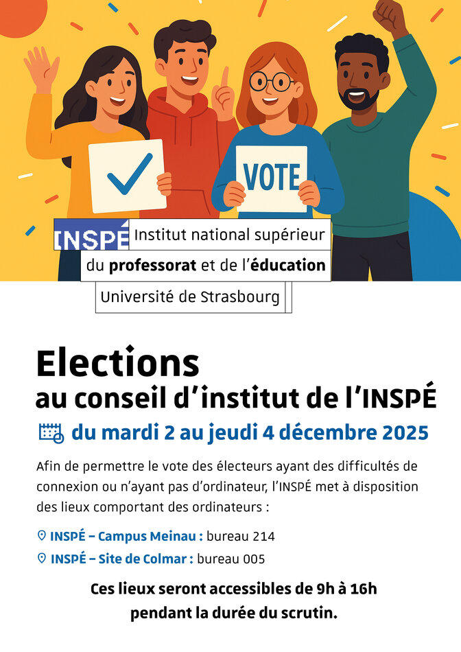 Les représentants inscrits dans les formations diplômantes de l’INSPÉ (des étudiants, des stagiaires de la formation professionnelle continue, des fonctionnaires stagiaires et/ou représentants des personnels enseignants et d'éducation bénéficiant d'actions de formation continue et des personnes bénéficiant d'actions de formation aux métiers de la formation et de l'éducation) : 4 sièges