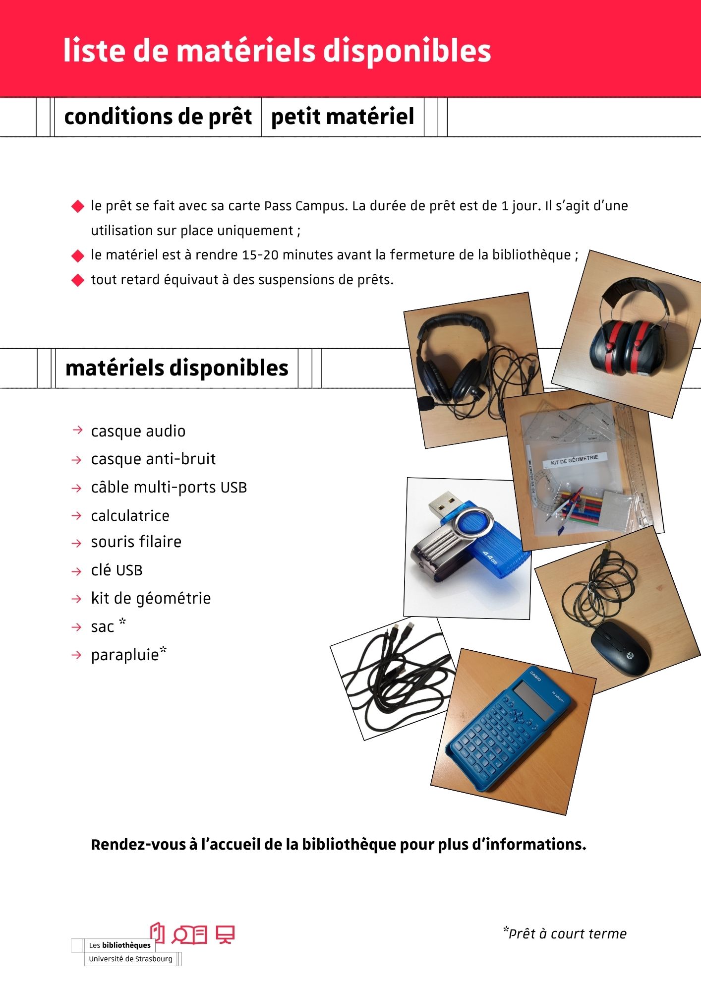 A la bibliothèque éducation et enseignement, nous prêtons aussi du petit matériel : calculatrices, câble multi-ports USB, kit de géométrie ... et surtout des casques anti-bruit. La durée du prêt est de 1 jour et sur place uniquement à part pour les sacs et les parapluies.N’hésitez pas à vous en servir !