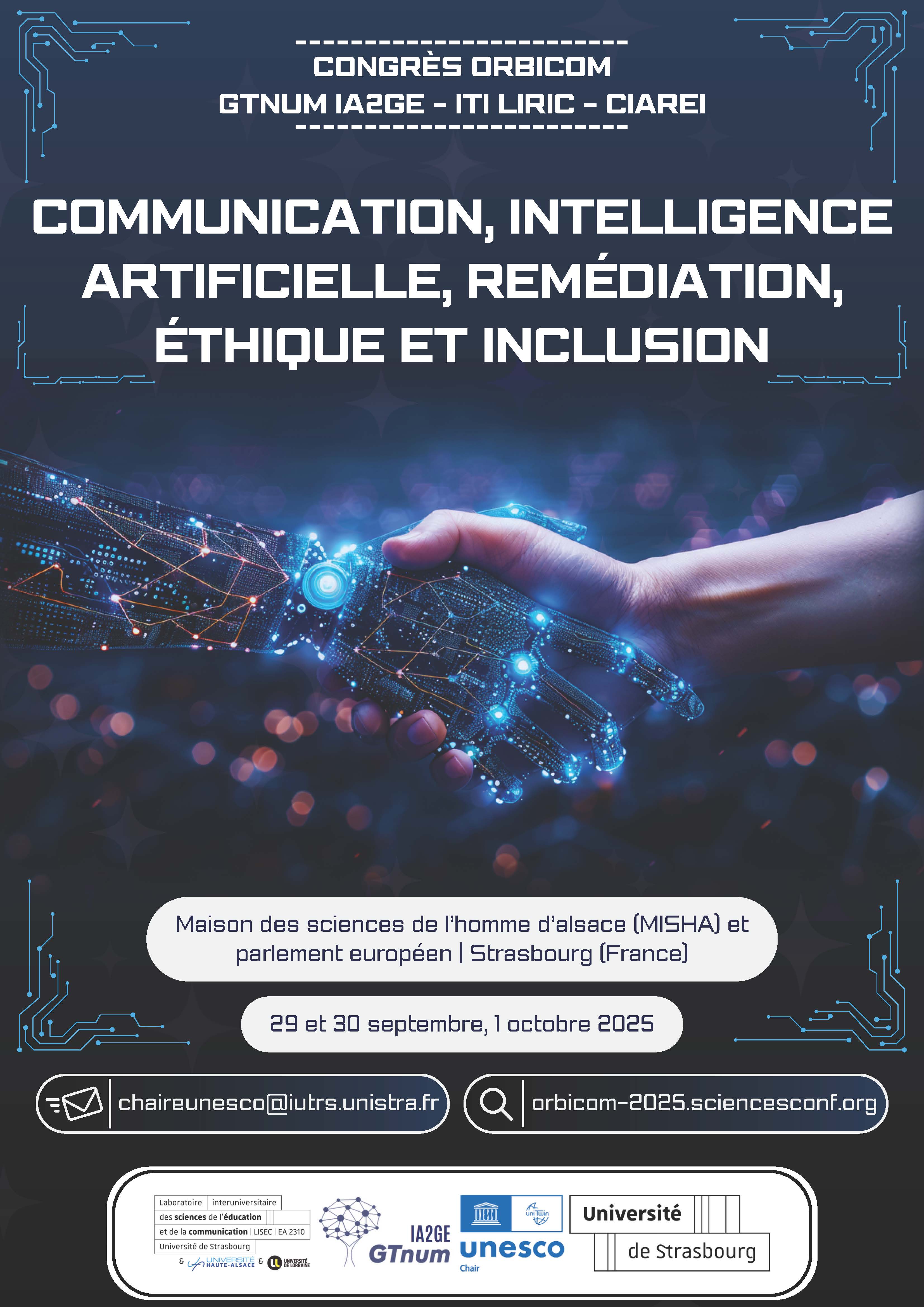 Le Congrès Orbicom - GTnum - ITI LiRic CIAREI pour « Communication, intelligence artificielle, remédiation, éthique et inclusion » a pour objectif de faire le point sur les opportunités et les risques liés au développement de l’intelligence artificielle générative (IA) dans la communication, notamment avec une perspective d’usage éthique et d’inclusion ainsi que de remédiation aux problèmes sociétaux.
