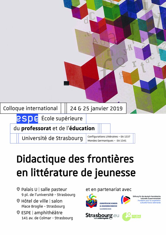Le colloque international "Didactique des frontières en littérature de jeunesse" entend jeter un pont culturel entre littérature, enseignement, auteurs et lecteurs, par delà nos proches frontières. En outre, ce colloque marquera le moment important de la proclamation des auteurs finalistes du Prix franco-allemand pour la littérature de jeunesse 2019.