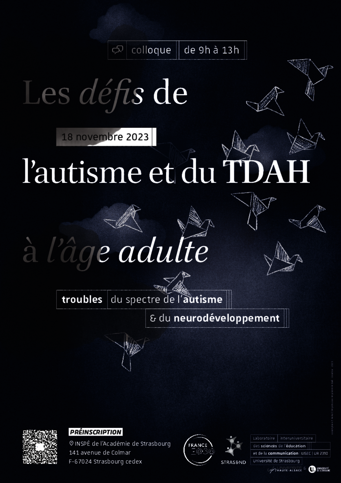 Après une première session sur La pédagogie face à la diversité des troubles du neurodéveloppement qui s'est déroulé le 14 octobre 2023 à Mutzig, une deuxième session sur Les défis du TSA et TDAH à l’âge adulte a lieu le samedi 18 novembre 2023 à l'INSPÉ de l'académie de Strasbourg.